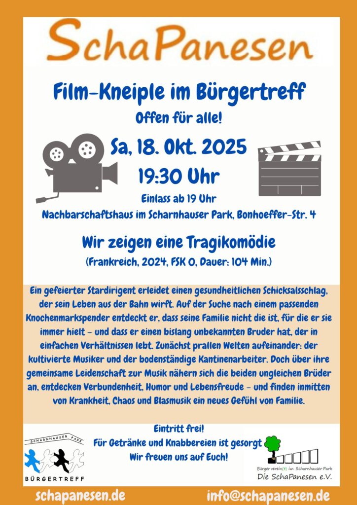 Herzliche Einladung zum Filmkneiple im Bürgertreff am 18. Oktober 2025. Wir zeigen eine französische Tragikomödie (2024), keine Altersbeschränkung, 104 Min.